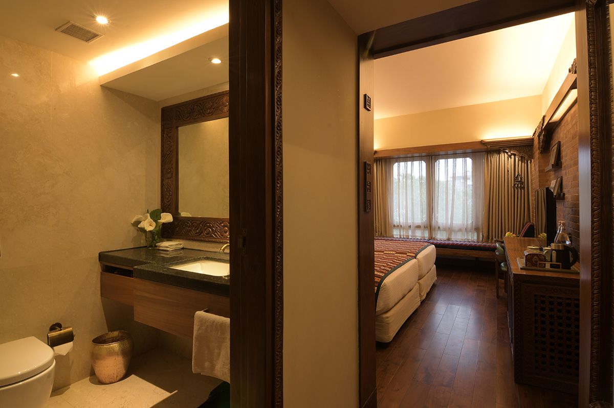As daylight streams through large windows, you're treated to calming views of the hotel’s serene gardens, plants, and peaceful walkways offering a breath of fresh air and a moment of stillness. Whether you're sipping tea by the window, journaling at the desk, or simply lying back and soaking in the ambiance, the Heritage Deluxe Room invites you to slow down and reconnect. This room is an intimate encounter with Nepal’s rich heritage, brought to life with warmth, comfort, and authenticity.