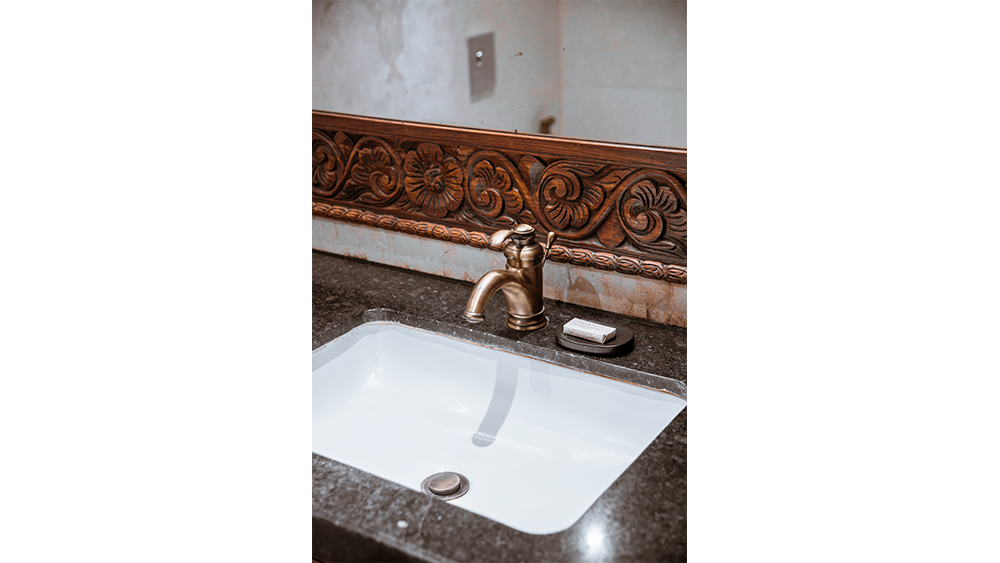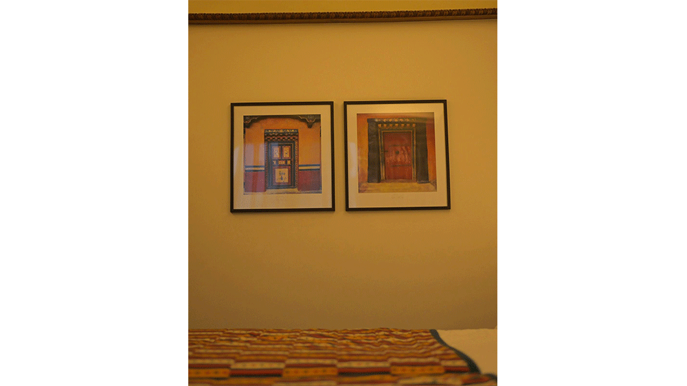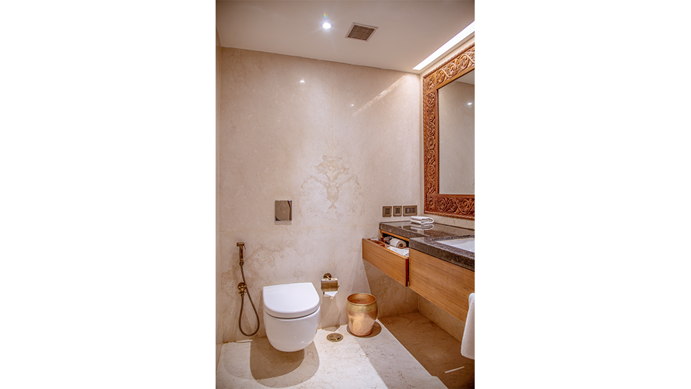 The room is a beautifully curated space where every detail tells a story. From locally inspired paintings to ornamental panas (traditional oil lamps) and fine woodwork, the atmosphere is one of quiet elegance and cultural depth. Gentle lighting casts a warm glow across the room, creating a peaceful retreat that soothes both body and mind.